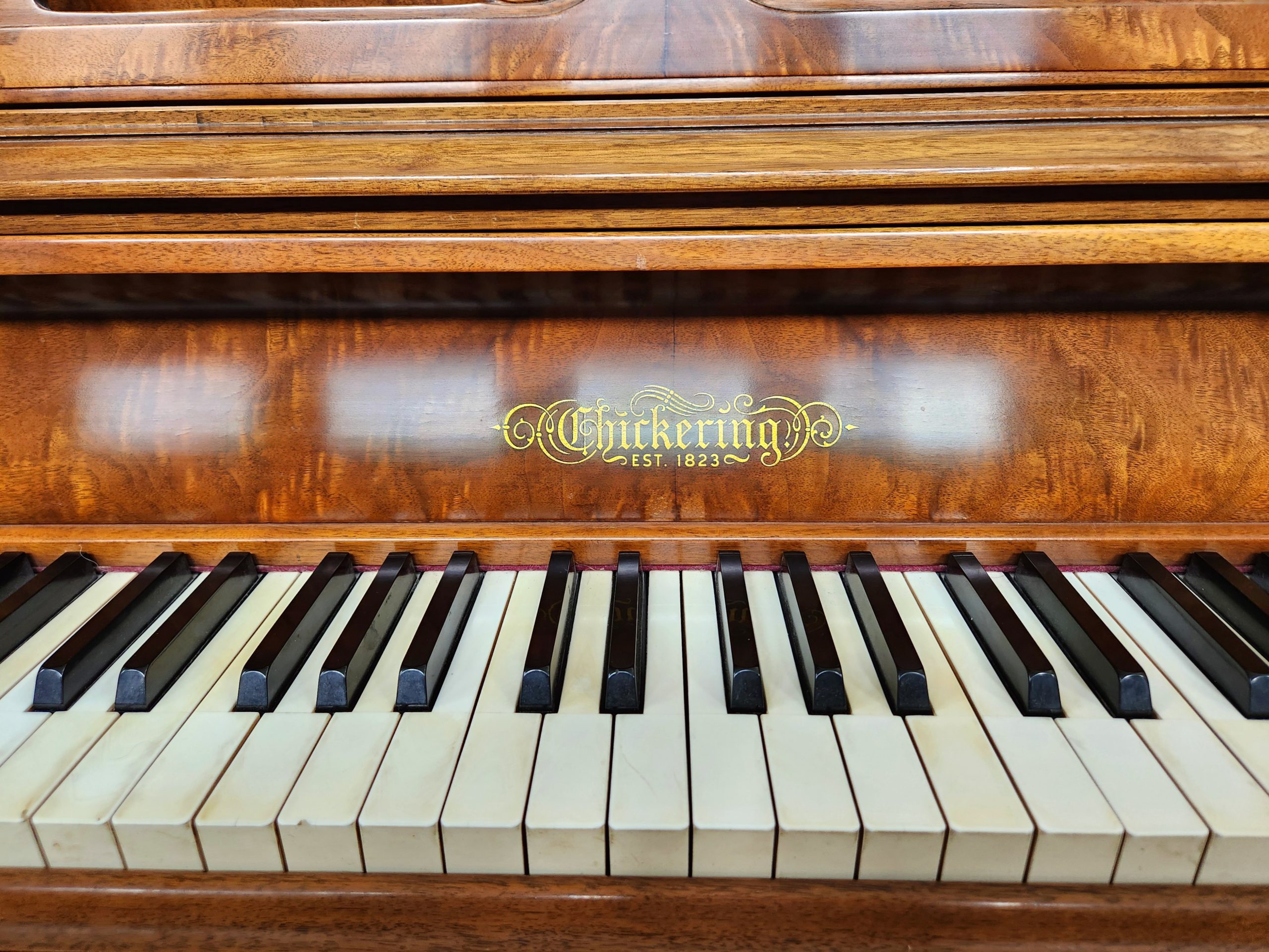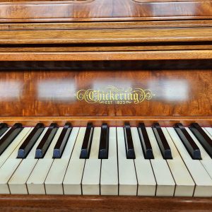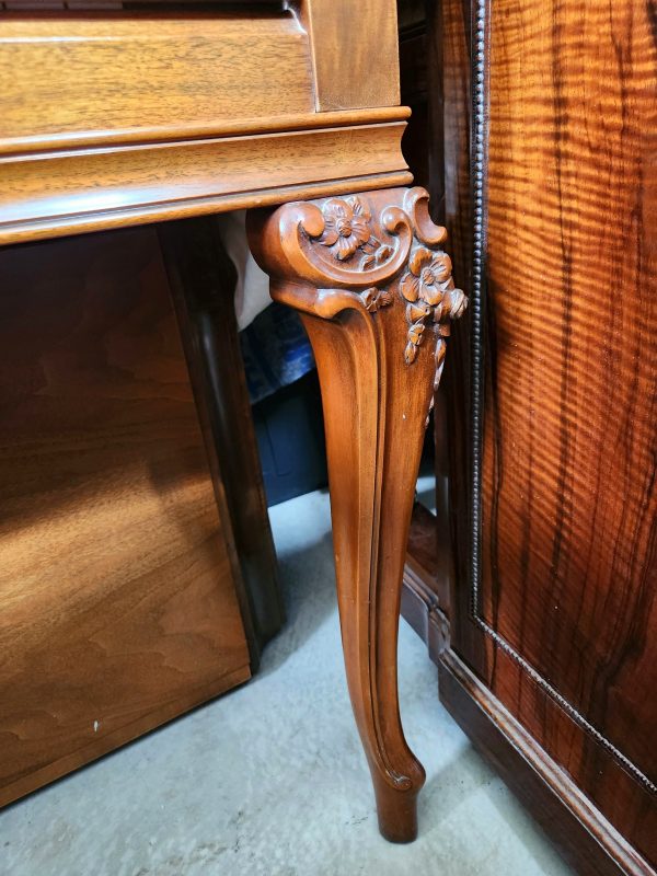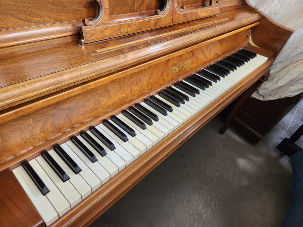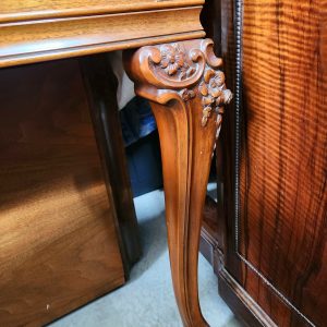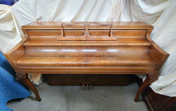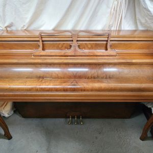 This piano has ivory keys and curved legs with pretty floral carvings. Comes with a matching bench.