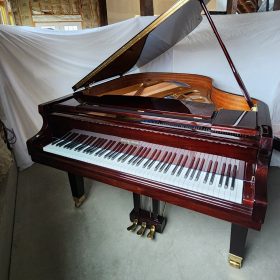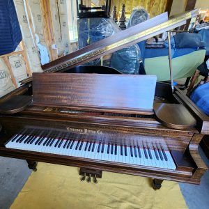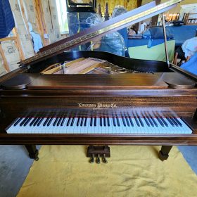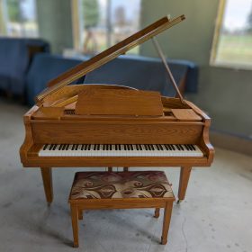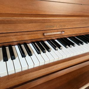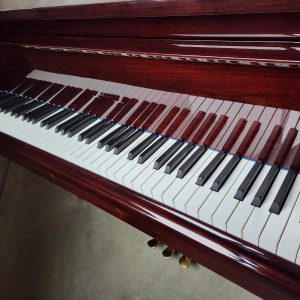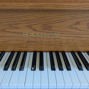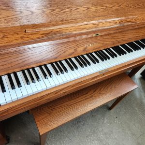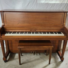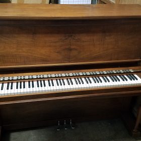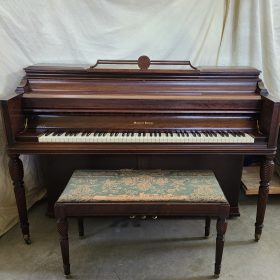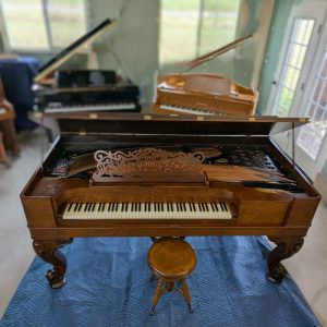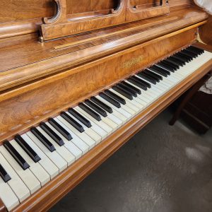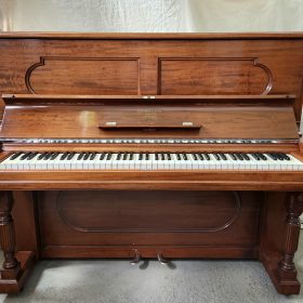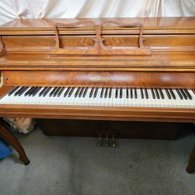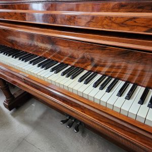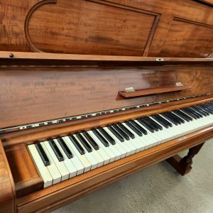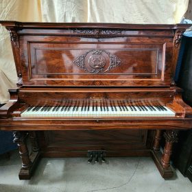 This Shoninger upright piano is in exquisite rebuilt condition. The instrument’s intricate hand-carved caricatures and high-polished finish add to its quality and uniqueness.